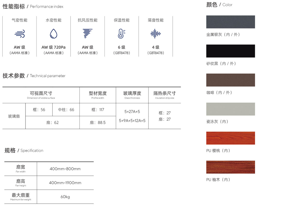 - 型材壁厚 1.4,可通過 20mm 隔熱條轉換 110 系列, 主框型材與雙內開共用
