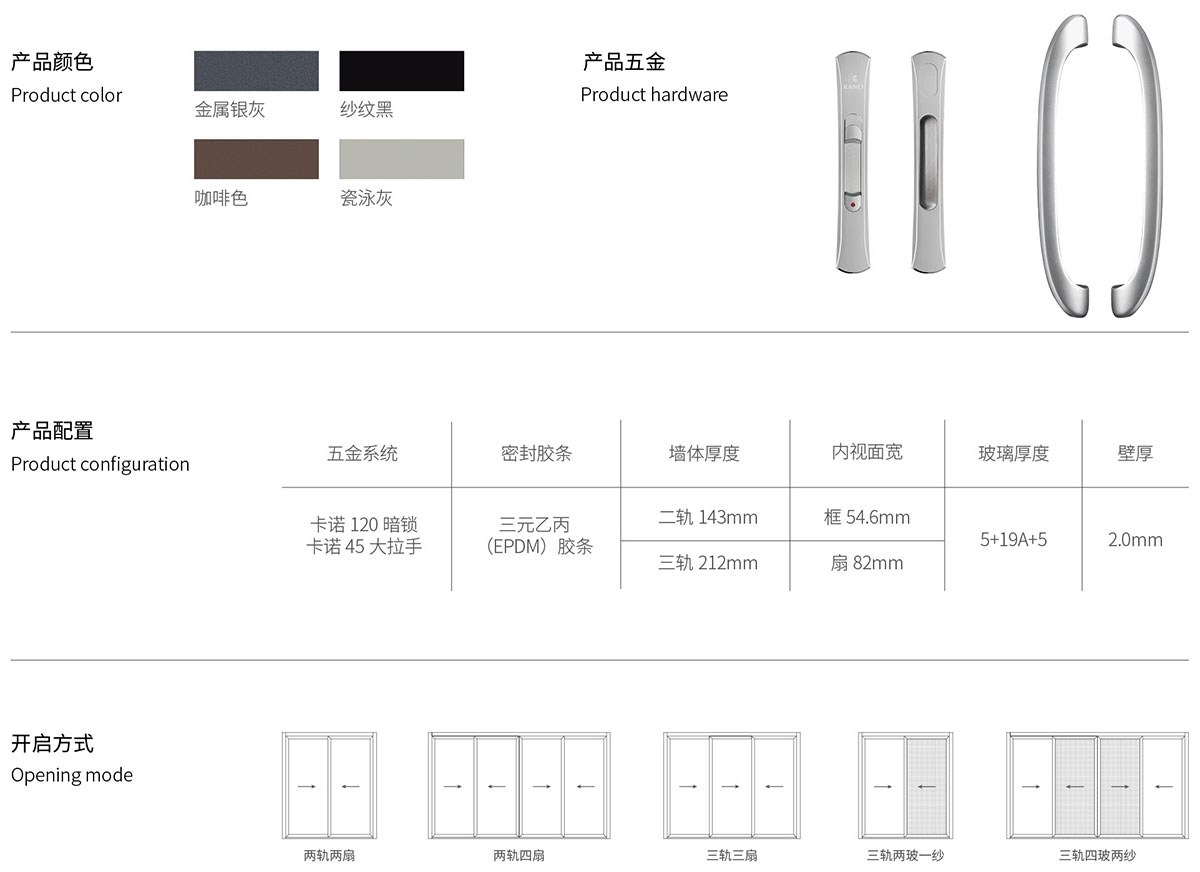 - 采用國家標準高精級鋁型材及卡諾專展定制五金配件 ,豪華大氣 ,內置多鎖點的結構設計 ,令防盜、安全性能更為優(yōu)越。